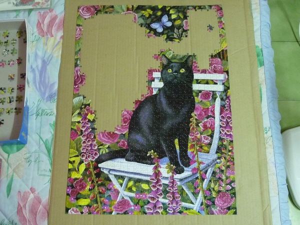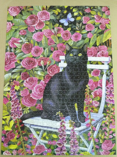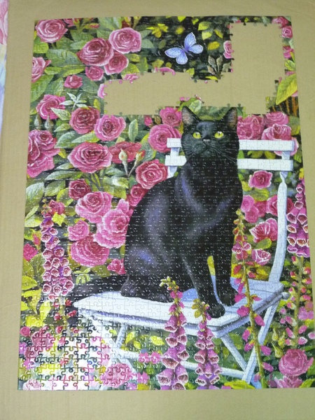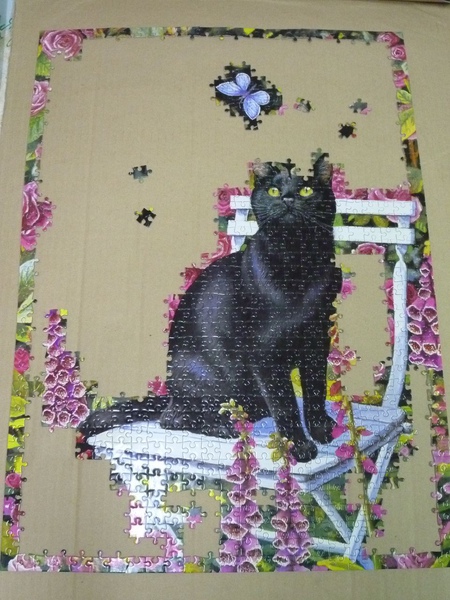 首先把明顯的黑色跟白色挑出來,拼出了椅子上的小黑貓